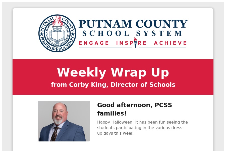 Weekly Wrap Up from Corby King, Director of Schools Good afternoon, PCSS families! Happy Halloween! It has been fun seeing the students participating. . .